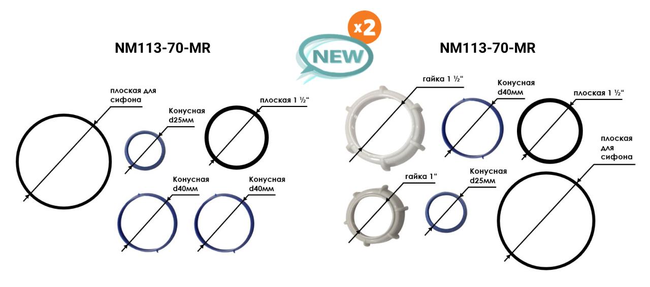С 1 мая 2021 года мы вводим третий артикул с базовой ценой всего в 44 руб. – это Ремонтный набор №1, в который входят прокладки конусные 25мм – 1 шт. и 40 мм - 2шт; прокладки плоские 1 1/2" и для чаши сифона Аквант. И в паре к нему вводим в ассортимент набор №2 (макси) с гайками 1 1/2” и 1”.